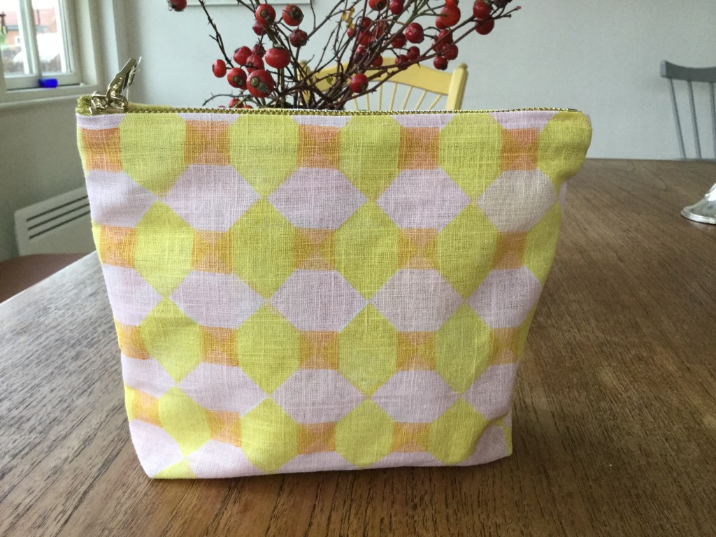 Tryk på hørstof og med messing-lynlås. Ca. 20×20 cm.