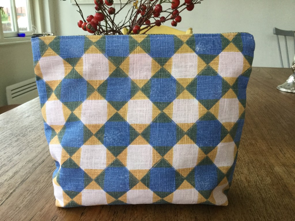 Tryk på hørstof og med blå lynlås. Ca. 20×20 cm.